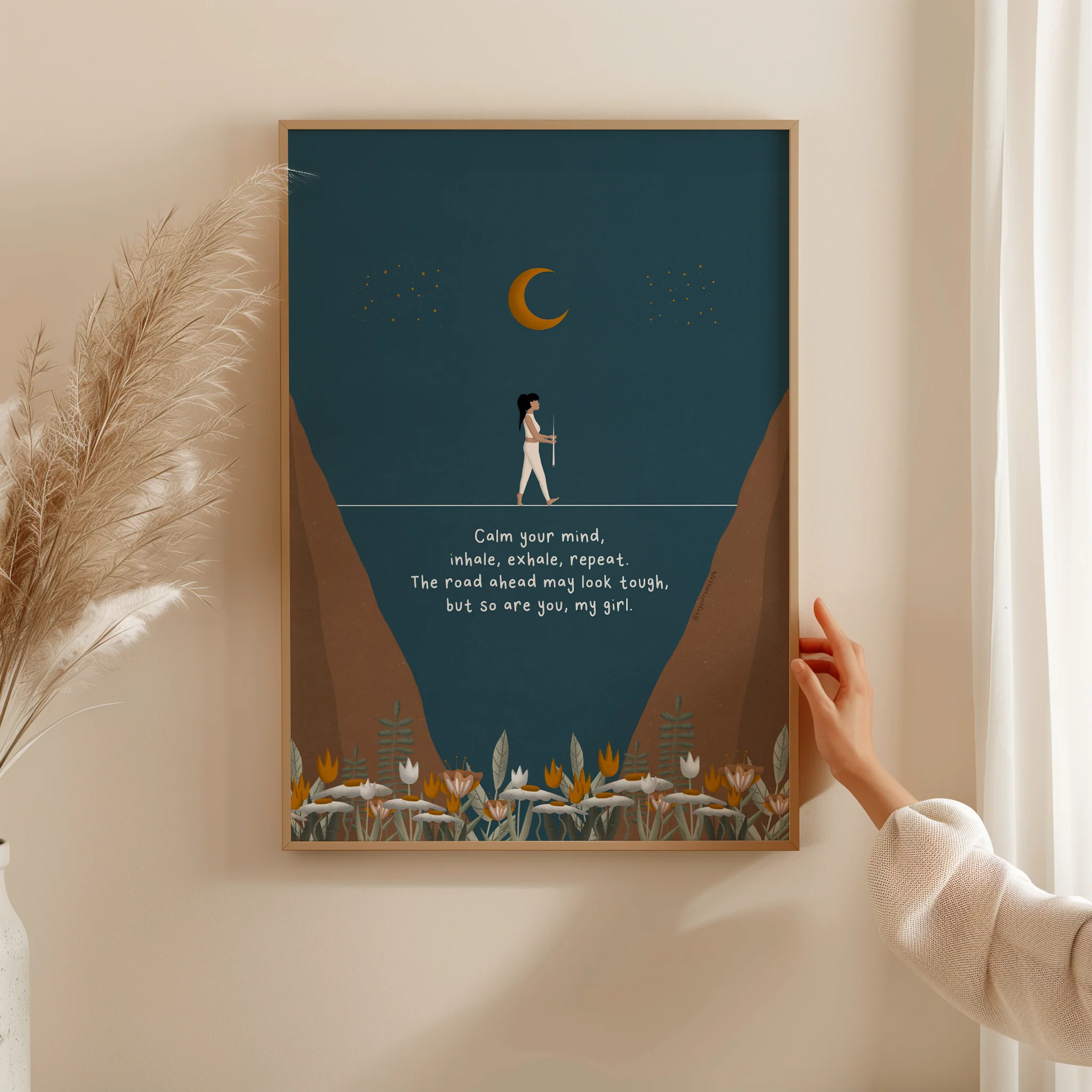 Elevate your home decor with this inspiring and motivational art print. This illustration features a powerful quote that is perfect for any woman's space. Printed on high-quality paper, this art print adds a touch of inspiration to any room. Transform your home into a haven of self-care with this beautiful print.
