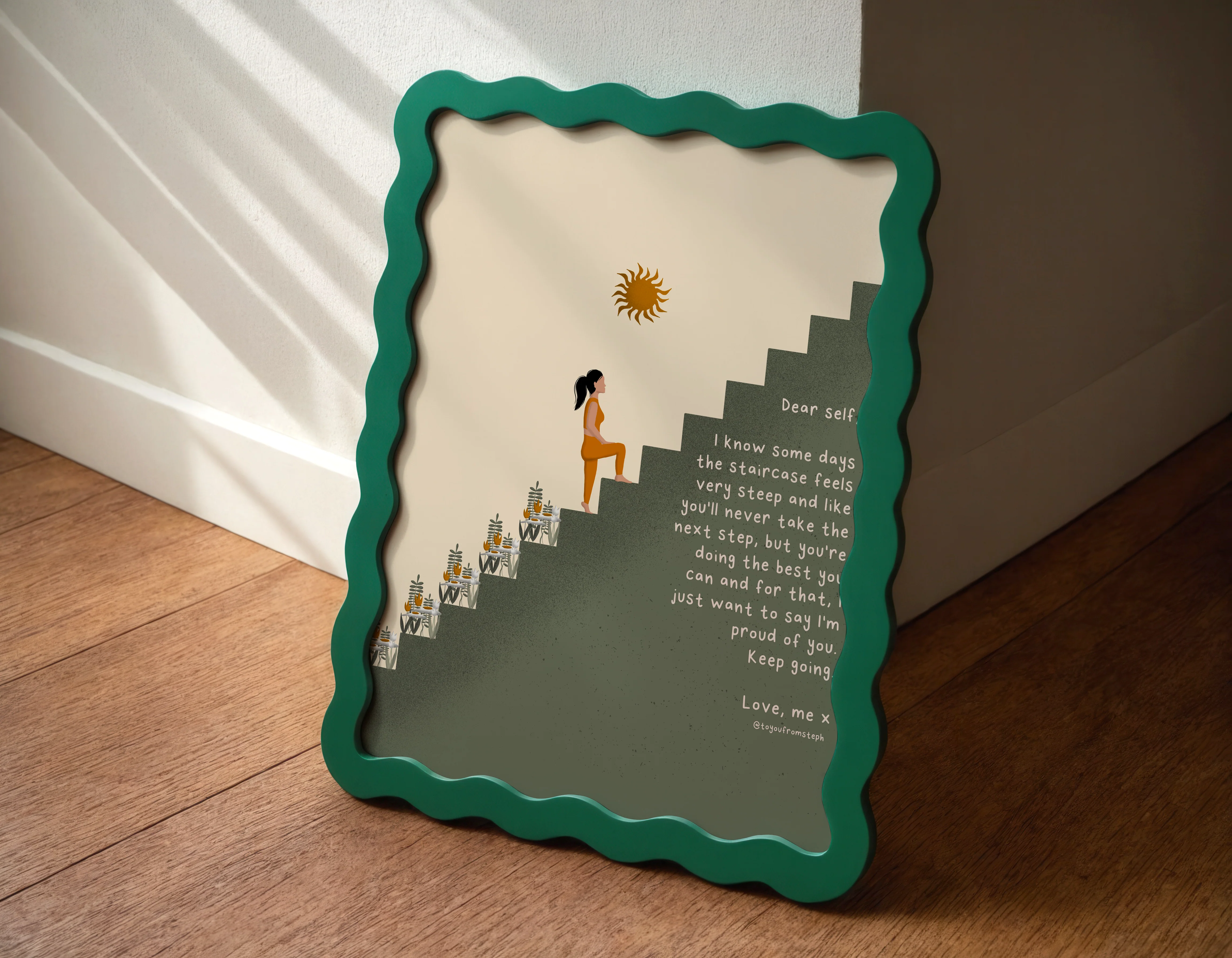 Elevate your home decor with this inspiring and motivational art print. This illustration features a powerful quote that is perfect for any woman's space. Printed on high-quality paper, this art print adds a touch of inspiration to any room. Transform your home into a haven of self-care with this beautiful print.