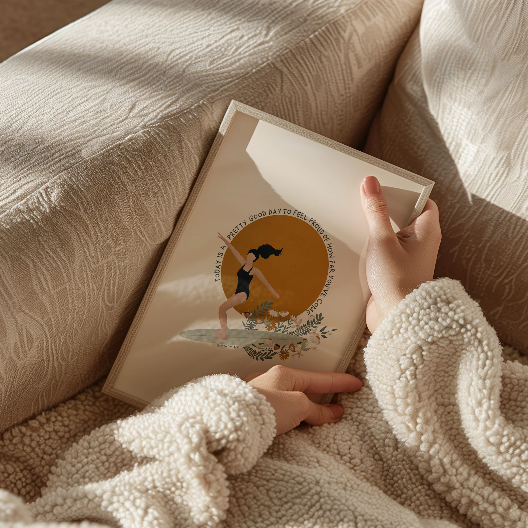 Elevate your home decor with this inspiring and motivational art print. This illustration features a powerful quote that is perfect for any woman's space. Printed on high-quality paper, this art print adds a touch of inspiration to any room. Transform your home into a haven of self-care with this beautiful print.