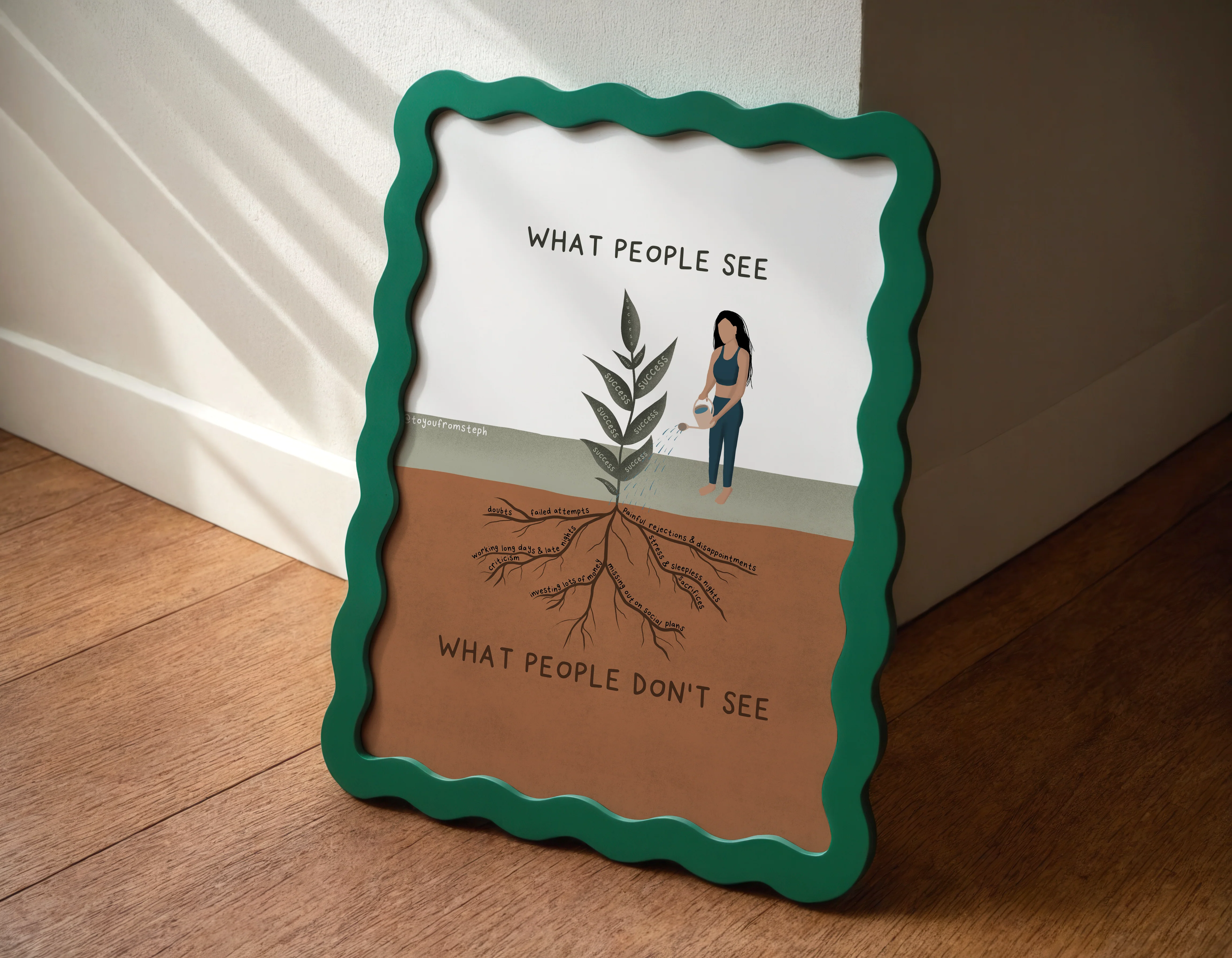Elevate your home decor with this inspiring and motivational art print. This illustration features a powerful quote that is perfect for any woman's space. Printed on high-quality paper, this art print adds a touch of inspiration to any room. Transform your home into a haven of self-care with this beautiful print.